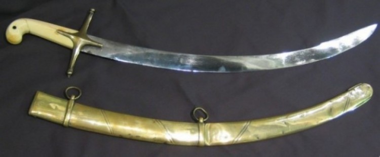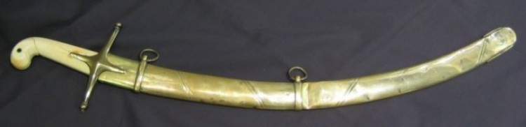 Mameluke Naval Hanger, c. 1800, Diamond shaped brass cross guard with ball finials on quillions, Ivory grip, a 24 inch curved blade with a 6 inch false spear point return, brass scabbard with two ring mounts and engraved “Read / No. 4 / Parliament S.”